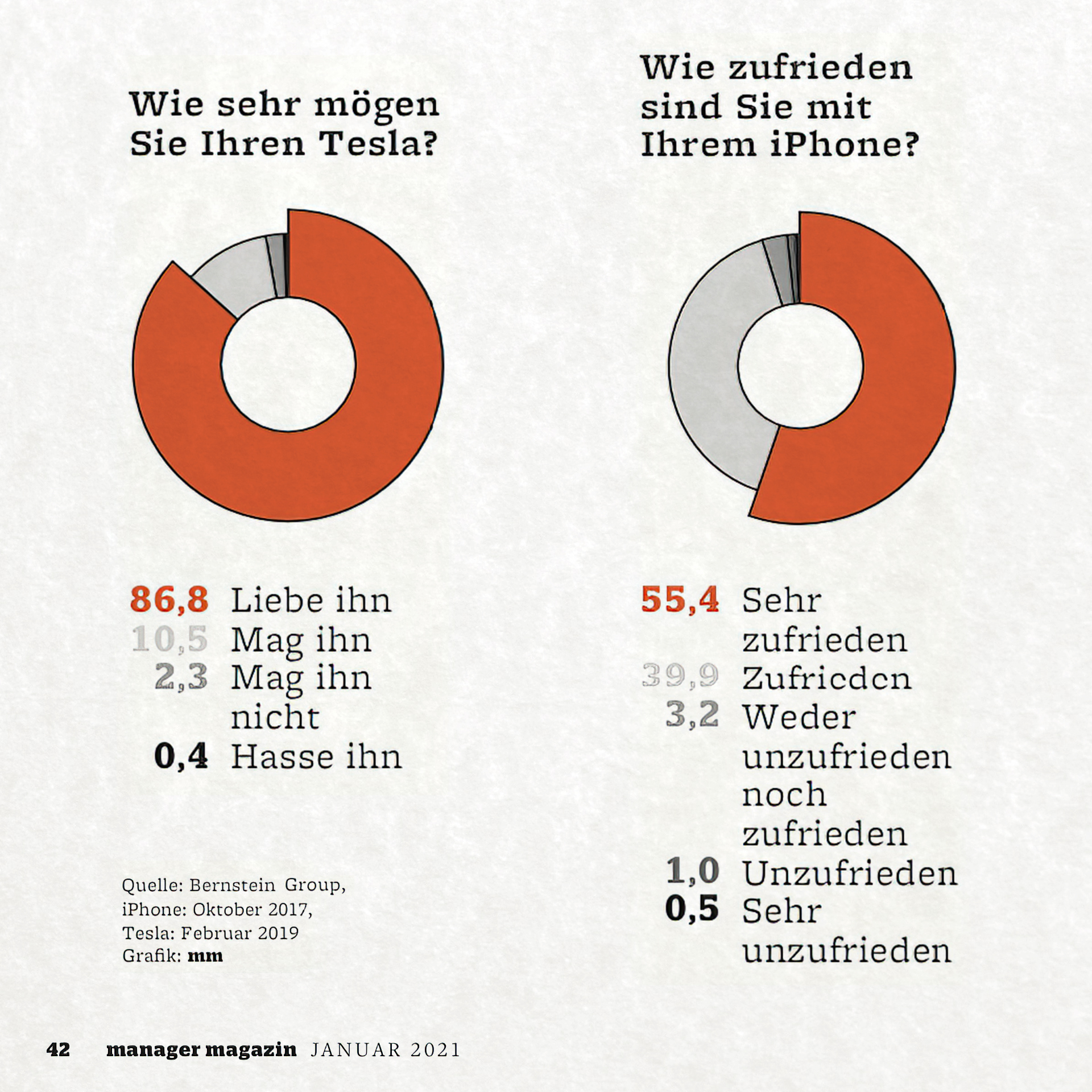 Dann habe ich noch mal hingeschaut. Und mich geärgert. Ist lieben, mögen oder hassen dasselbe wie sehr zufrieden, weder noch oder sehr unzufrieden? Und dann das: 97,3 Prozent lieben oder mögen ihren Tesla, 95,3 Prozent sind sehr zufrieden oder zufrieden mit ihrem iPhone.