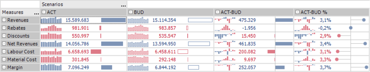 As you can see in the chart above, the graphical elements differ accordingly. This example uses filled bars to show actuals and empty bars to display budget values. While absolute variances are drawn with a bar to the left and right of a line representing zero, relative variances are illustrated using points to the left and the right of the line. For more information, please read DeltaMaster deltas! 5.3.5, feature #1.