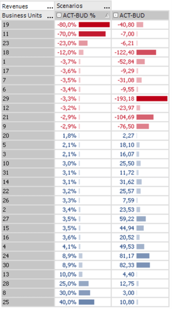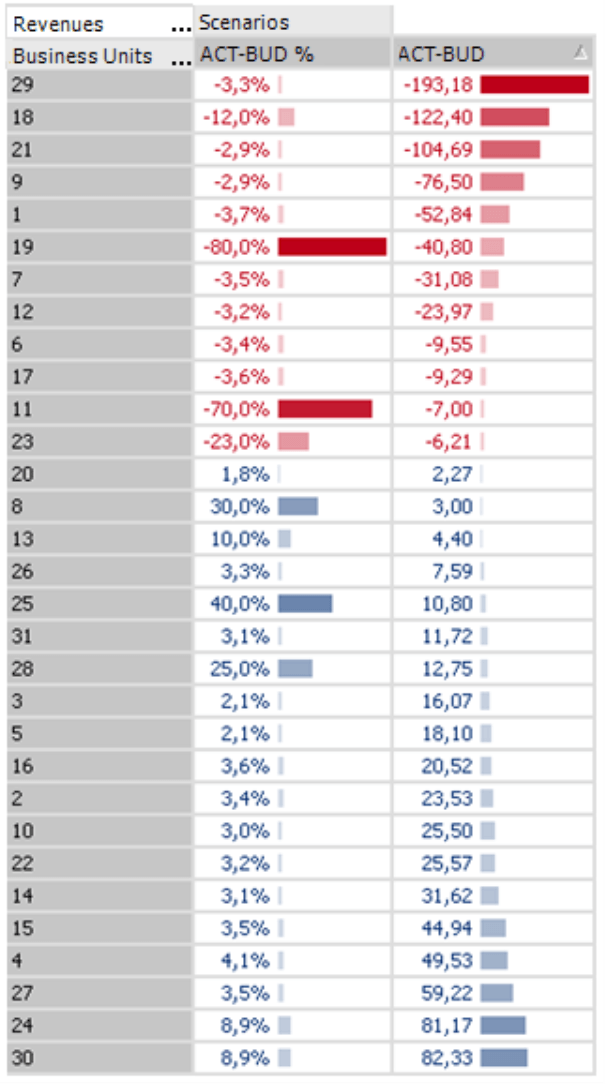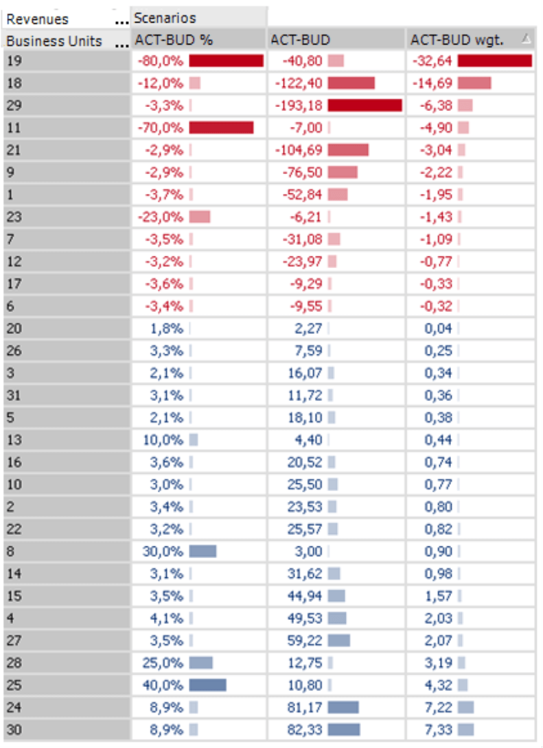 In the screenshot on your right, therefore, we have added a third column containing the weighted variance and have sorted the table based on this column. And look: the truly critical business units are now located at the top of the list. This chart now takes absolute and relative variances into account and combines them to create a powerful message.