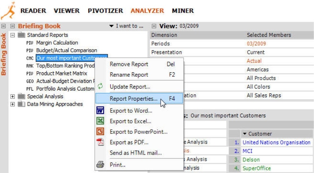 Resourceful Miner, Analyzer and Pivotizer users can utilize this function as well. In order to change the view in all reports of a folder, you simply switch to Viewer mode, select the desired folders in the Briefing book, change the view, and DeltaMaster will automatically make this change in all of the respective reports and subfolders. Afterwards, you can switch back into your preferred user level. In particular, if you want to modify your view in multiple dimensions, this option is much faster than to chose to Refresh the folder (context menu, I want to… menu) to change the report view.