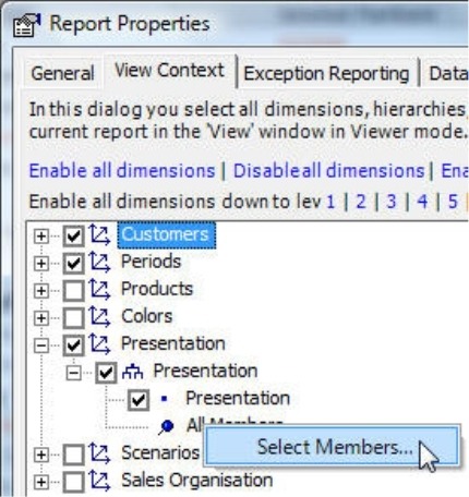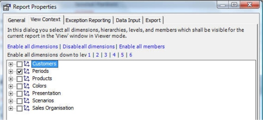 If you hadn’t marked the ‘Country’ and ‘Total Customers’ levels in the View context, Viewer users would be able to see but not select them in the Dimension browser. As a result, you could save a report with a view that Viewer users can open but cannot modify. That could be intentional. If not, you should select the desired levels and all of their respective parents including the top level.