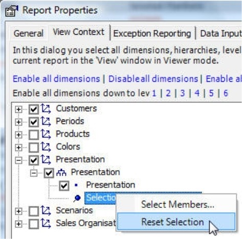 Once you have selected the members in the Dimension browser, DeltaMaster will display these members in place of the ‘All members’ label in the View context. The context menu now contains the option to Reset [the] selection so that you can again display all hierarchy members in Viewer mode.