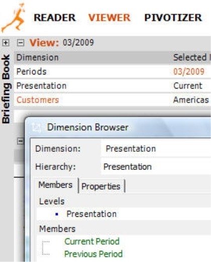 If you now switch into Viewer mode, you can instantly see the difference. Instead of all members from the presentation dimension, DeltaMaster will now only display the two selected members in the Dimension browser as shown in the screenshot on your right.