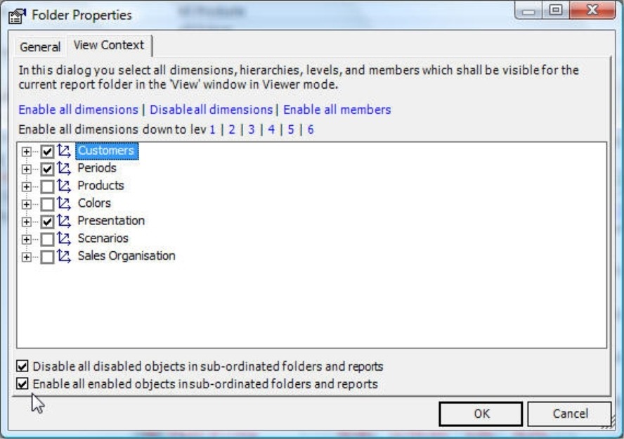 If you use this feature, the subordinate objects will not be permanently linked to the folder properties. DeltaMaster will simply enter this selection once in all respective reports and folders. That way, you can alter this ‘default’ setting to apply a different View context to individual reports.
