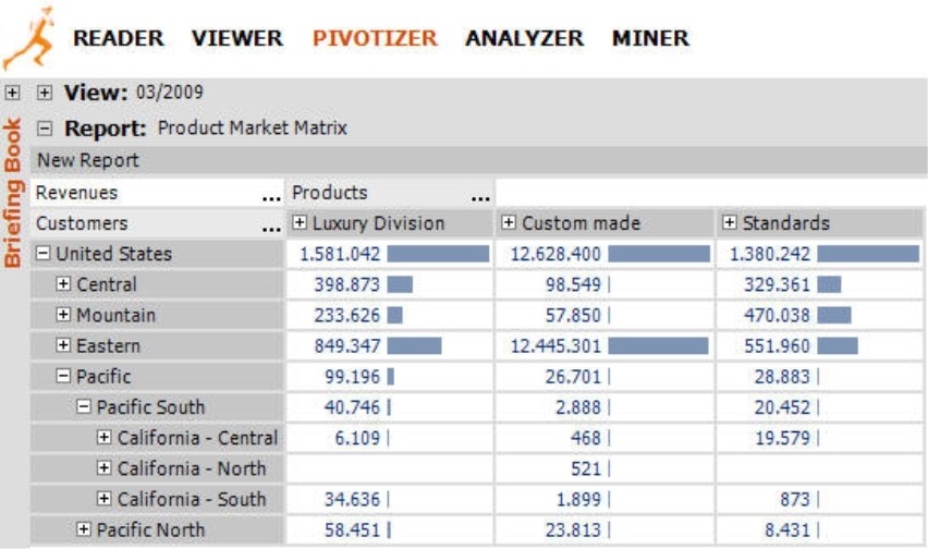 If your report consumers in Viewer mode don’t need to know the revenues of individual customers, a drill down to states (e.g. California Central etc.) would provide adequate detail. Therefore, you can give them the option to drill down to this level and collapse or expand the individual branches as they wish. Since they don’t need to differentiate among Luxury Division, Custom Made, and Standards, however, you don’t need to enable a drill down by main product groups.