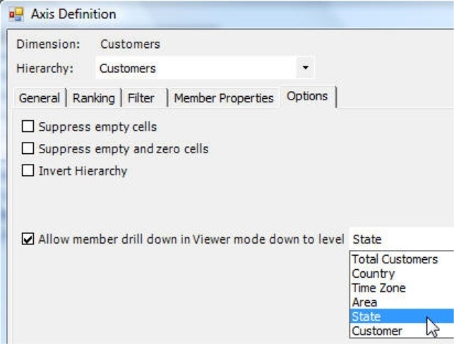 If you limit the drill down level in Viewer mode, this will not affect how members are displayed in saved reports. In other words, Viewer users could see members on levels for which they have no drill-down access. If you collapse these branches in Viewer mode, therefore, you will not be able to expand them again. In order to see these branches again, you would have to reopen the report.