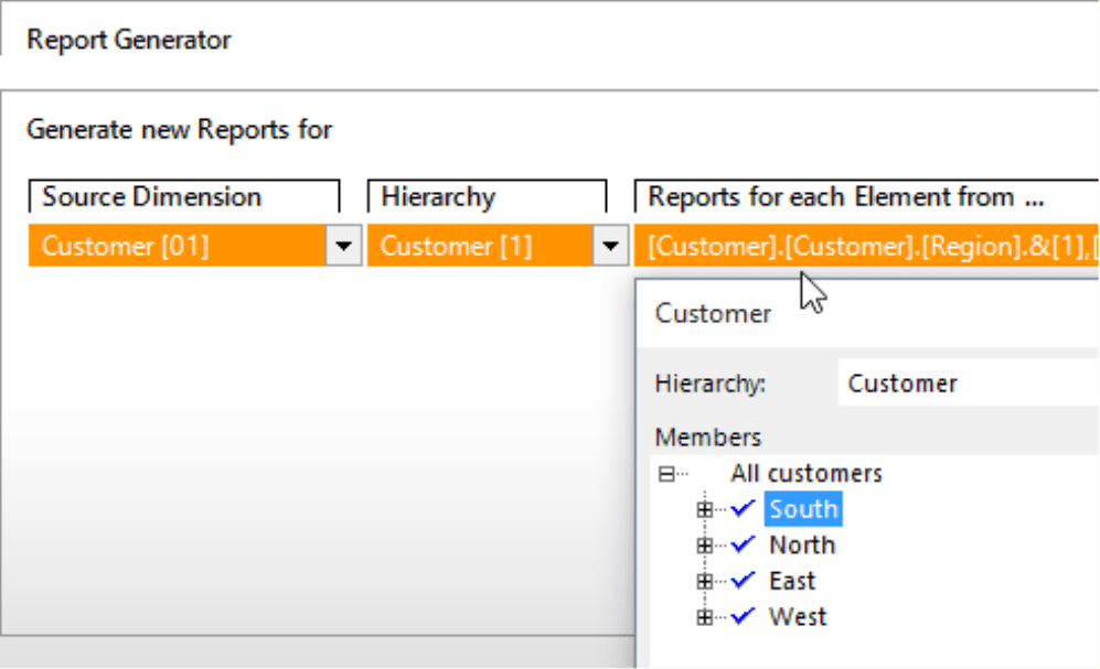 - In the Report Generator, you can define several members that are processed in a loop (iteration) to change the View (filters) repeatedly. The report generator has a direct effect on the output in step 3. It generates a separate output for each member of the loop, for example, an individual briefing book sent by email to each sales representative, cost center manager, and so on. Let’s say, for example, that the members “North”, “South”, “East”, and “West” are selected in the customer dimension. DeltaMaster will then switch all reports from the report source to the member “North”, calculate them with this filter, generate the output (e.g. as an HTML file), and distribute them (e.g. as an email). The next member in line (e.g. “South”) will follow. DeltaMaster again switches the filter in all reports, recalculates them, generates the output file(s), and sends the result(s). This process continues with “East” followed by “West”.