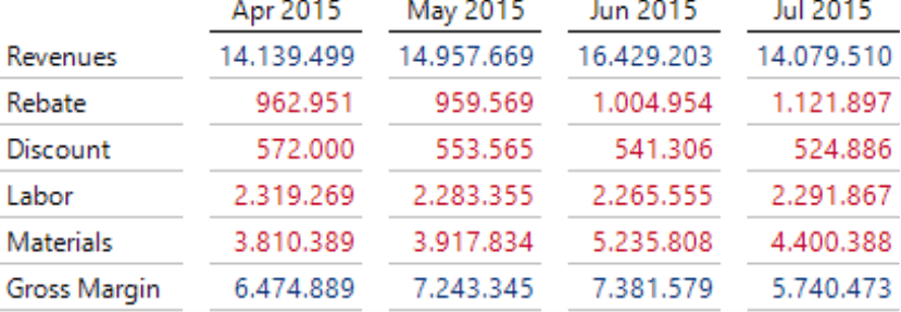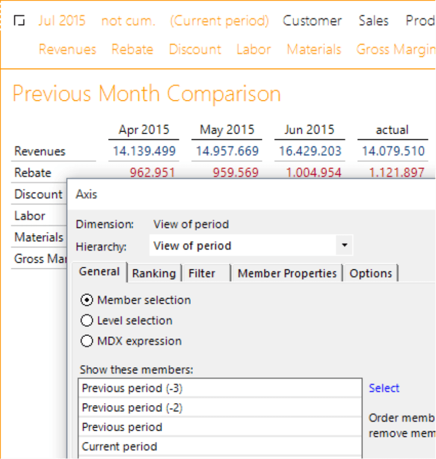 The better approach is to describe the reporting task abstractly. After all, the report should actually display the current month and the three months prior regardless what the current month is – and not simply April, May, June, and July. To do this in DeltaMaster, you could use time analysis members, which are usually designed as an auxiliary time utility dimension. The members “Current” and “Previous Period” are frequently already available. That means that you would only need to add members for the two months prior to it: “Previous Period (-2)” and “Previous Period (-3)”.