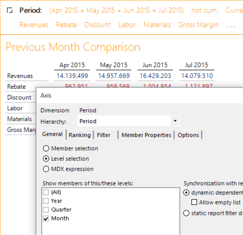 As a first attempt, you might generate the report by placing the months in the View and referencing them as a level selection in the Axis Definition. You can certainly do it that way, but there are better alternatives if you want to publish it. If you would use this report in the following month and place four new months in the report update, you would receive the desired result in this particular report. However, you would have to set this View for all other reports in the report source. In many other reports, this could cause undesirable results, for example, a calculation of the sum of the four months.