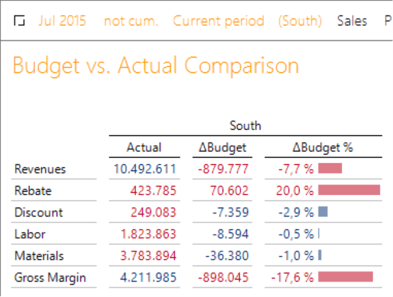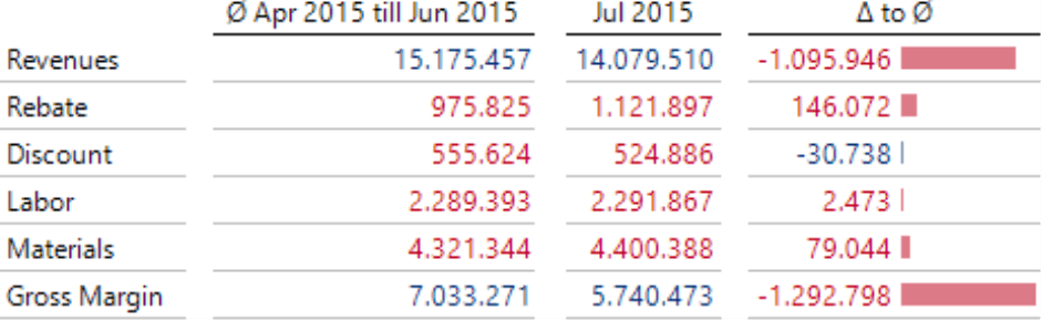 Please note that this is just an example. In a live application, we would recommend placing more than just a few months next to each other to enable comparisons. The example above would not suffice to send a signal or trigger actions. A more interesting option would be to calculate the three-month average and show the variance of the current month to this average. That sends a clear message! Please read DeltaMaster clicks! 07/2011 for step-by-step instructions.