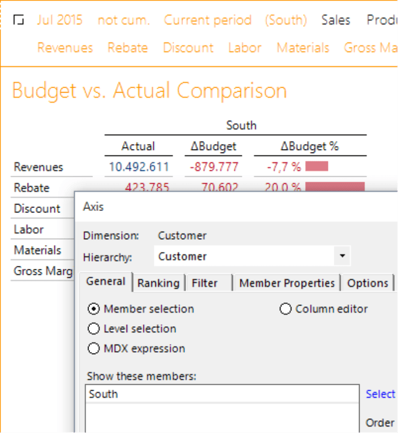 The report editor, in this case, decided to set the region as a member selection in the Axis Definition. You could already see this in the previous screenshot: The region “South” is listed in parentheses, which means that the filter is set in the current report but not used. The selection in the axis definition overrides the filter in the report. The Publisher cannot access a member that is set as a member selection in the Axis Definition. That is the nature of the member selection in the Axis Definition: Whatever is set here is valid – regardless of the View and, therefore, also regardless of Report Update and Report Generator.
