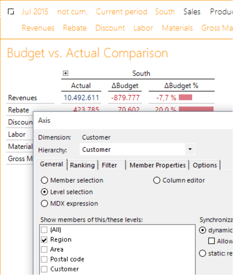 The solution is clear: You need to design the report so that the Axis Definition only contains the attributes that cannot be changed, for example, the column structure with time comparisons or variances. When working with dimensions such as customers, products, colors, offices, or cost centers, you should select them in the View and not the axis as a general rule.