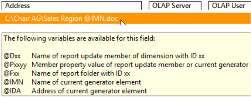 The path and file names may contain variables that will be replaced when the job is executed. “@IMN”, for example, stands for the member that Report Generator is currently processing. This could be the name of the sales region or cost center for which the report source is calculated. The address “C:Chair AGSales Region @IMN.doc”, for example, will produce the file names “Sales Region North.doc” and “Sales Region South.doc” when the report generator iterates over the members “North” and “South”. If you enter a variable instead of the file name for the directory, DeltaMaster will distribute the documents to individual directories (provided that the user running the job has the necessary write permissions).