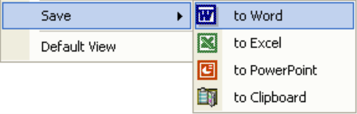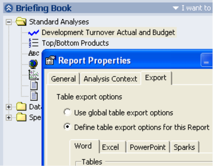 The context menu found in cockpits, analysis results and briefing books contains commands to output the currently displayed data into a Word, Excel, or PowerPoint document. Cockpits and analysis results offer the same option in the Save menu additionally, whereas in the briefing book it is contained in the I want to menu. During the export, the Office applications are “under remote control” by DeltaMaster. We do not use any macros as they are considered a security hazard in many places.