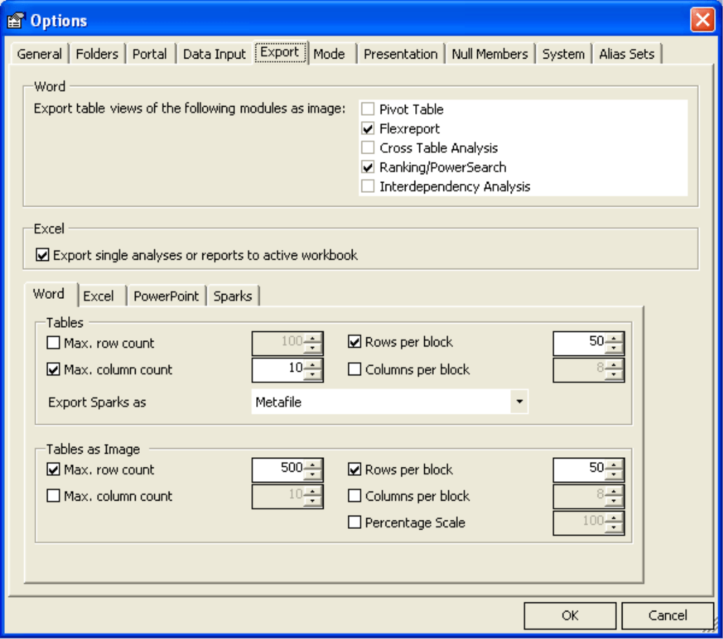 Word Here you determine that certain representations of tables will be rendered as images (bitmaps) instead of textual tables. The image export is recommended especially for flex reports with graphical components. For both variations, the number of lines and columns may be restricted to reduce calculation time during the export and to limit the display to the crucial details. Defining blocks leads to the segmenting of the tables into several smaller ones in order to arrange them conveniently on multiple pages.