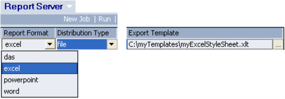 In ReportServer, you can specify templates for each job individually. First pick the report format (Word, Excel, or PowerPoint) and then choose the desired Export template. If you leave these fields empty, DeltaMaster will use the default template files as described above.