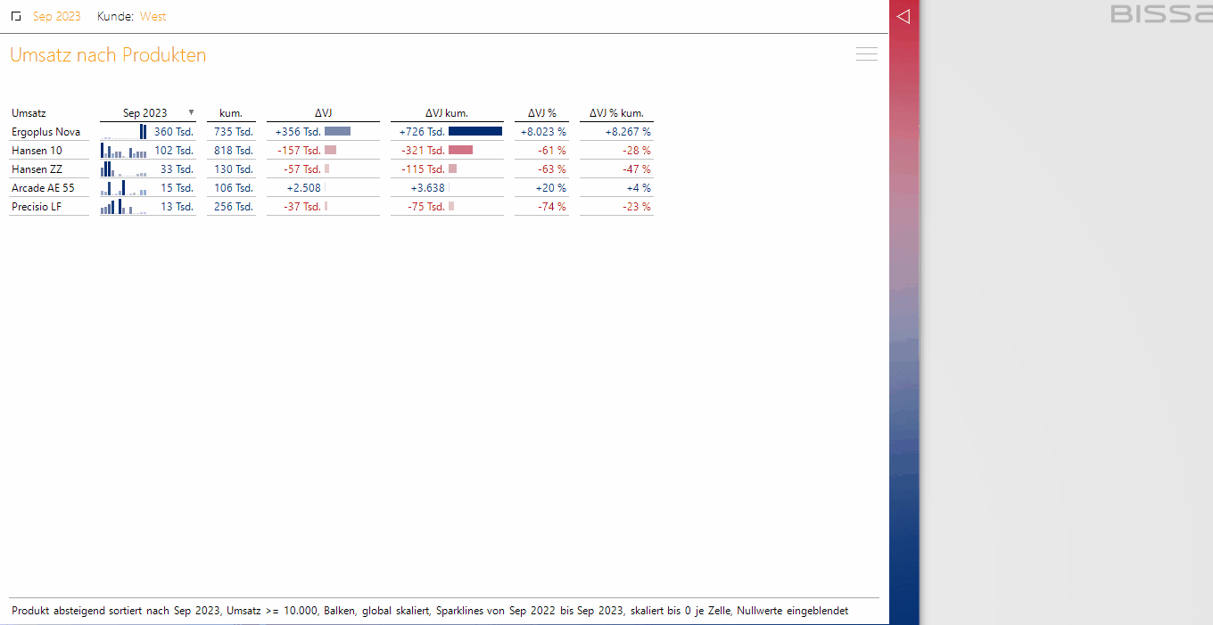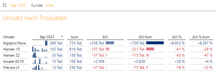 In der Region West finden wir eine überschaubare Menge von Produkten mit wenig beeindruckenden Umsätzen vor: