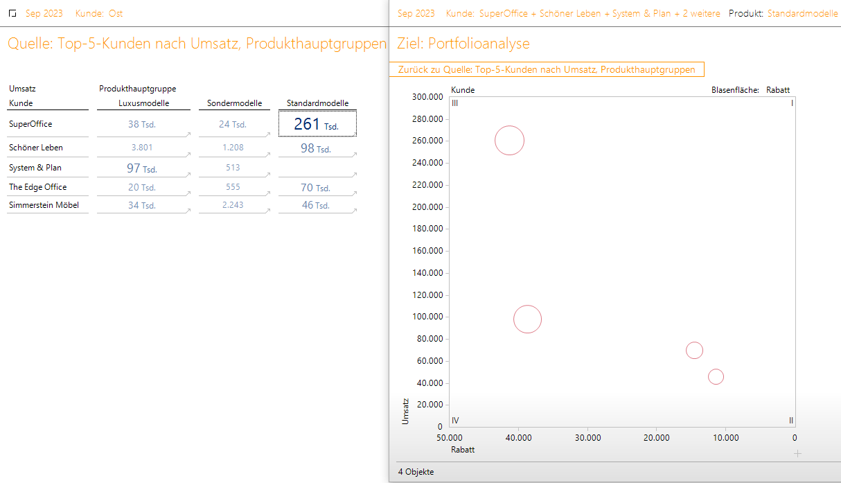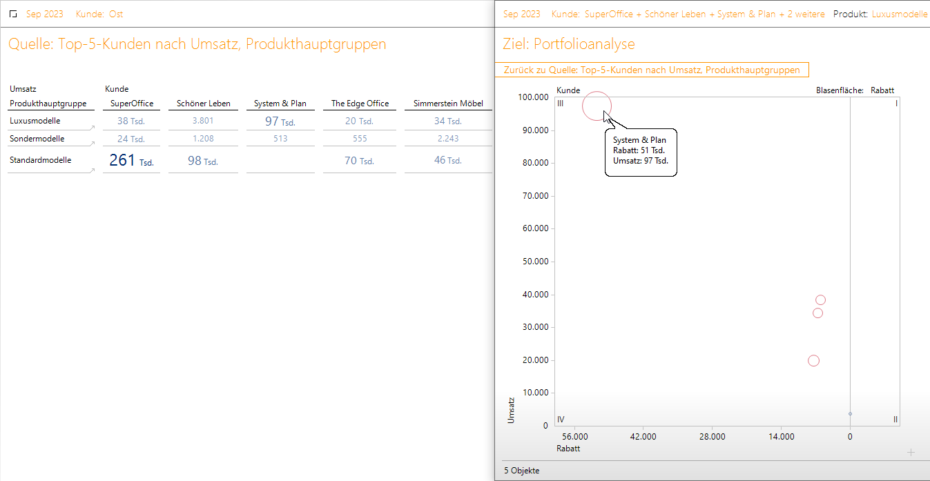 Wenn wir in die Filterleiste im Zielbericht schauen, so erkennen wir, dass nun der konkret gewählte Kunde SuperOffice die bisher verwendete Einstellung Kunde Ost überschrieben hat. Weiterhin ist nun die konkrete Produkthauptgruppe Standardmodelle zu sehen. Unsere Portfolioanalyse ist nun mit dem einzigen Element SuperOffice nicht mehr ganz so spannend.