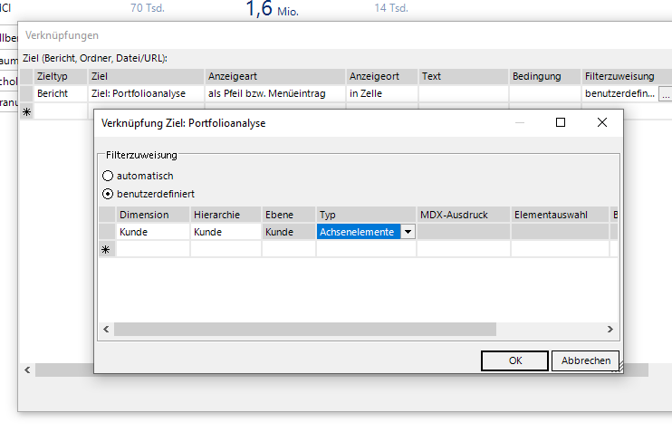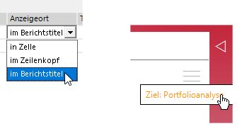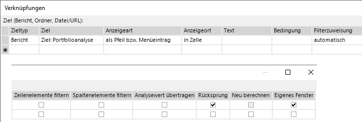 Wenn wir wie hier auf die Portfolioanalyse verweisen, wird eine etwaige Checkbox Analysewert übertragen ignoriert, da eine Portfolioanalyse mindestens zwei Analysewerte benötigt. Ein Analysewert wird nur dann übertragen, wenn der Zielbericht exakt einen Analysewert verwendet. Deshalb würde in diesem Beispiel eine Verknüpfung aus einer Zelle heraus immer ein identisches Ergebnis zeigen, da auch immer die kompletten Achsenelemente übertragen werden. Es bietet sich an, die Verknüpfung am Berichtstitel zu verankern.