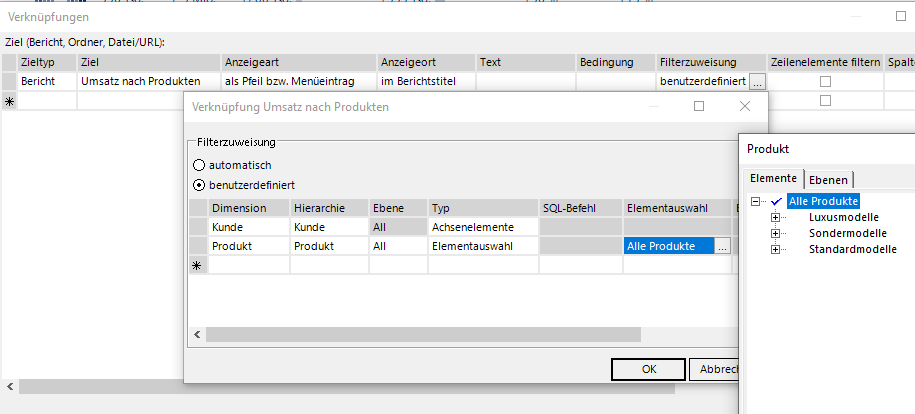 Bei der letzten Verknüpfung, die interessanterweise wieder auf den Ausgangsbericht zeigt, sollen die momentan ausgewählten Produkte ignoriert und an deren Stelle das Alle-Produkte-Element verwendet werden: