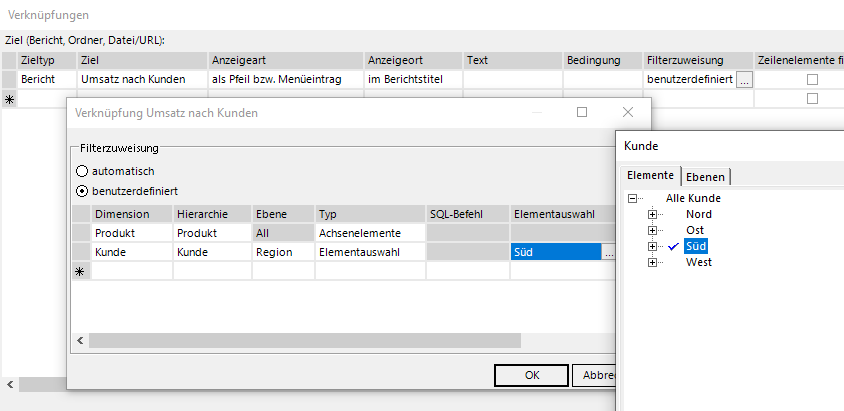 Man stelle sich einen Ziel-Bericht mit einem fixen Referenzelement vor, dessen Rolle hier im Demo-Beispiel von Süd übernommen wird. Es gibt in DeltaMaster keine Einstellung, die Filterübertragung eines Elements in der Filterleiste auf den Zielbericht grundsätzlich zu verhindern. Wir können jedoch ein gewünschtes Filterelement bei der Verknüpfung selbst setzen.