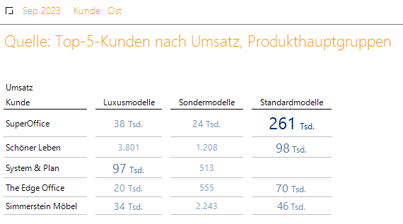 Wir aktivieren nun die Checkboxen Zeilenelemente filtern und Spaltenelemente filtern und wählen wieder wie anfangs den Anzeigeort in Zelle. Klicken wir nun auf einen Pfeil in einer Zelle, zum Beispiel auf die 261 Tsd. beim Kunden SuperOffice und bei Produkthauptgruppe Standardmodelle, so werden diese beiden Elemente übertragen: