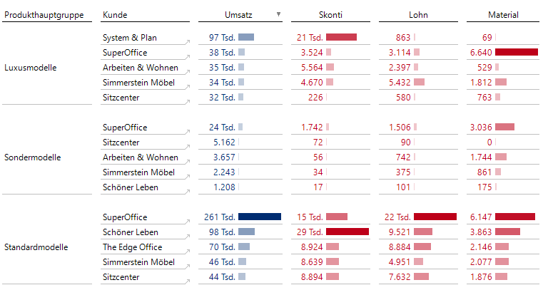 Möchte man in diesem Beispiel nicht die Top-5-Kunden global über alle Produkthauptgruppen, sondern die individuellen Top-5-Kunden jeder einzelnen Produkthauptgruppe sehen, bietet sich die Option Hierarchien ineinander schachteln an. Sie befindet sich auf dem Reiter Optionen der Achsendefinitionen, die Sie über Achse bearbeiten bei Rechts-Klick auf eine der Achsen erreichen. Nun besitzt jede Produkthauptgruppe eine eigene Top-5 der Kunden nach Umsatz:
