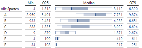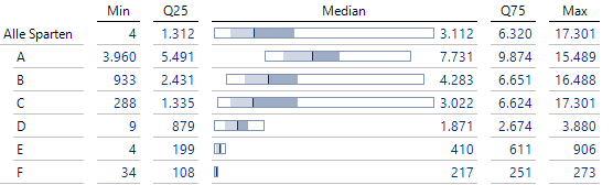 Um die Sparten mittels der Verteilungsanalyse zu vergleichen, wären mehrere Berichte nötig: für jede Sparte ein eigener Bericht. Für einen schnellen Vergleich ist die Grafische Tabelle mit Boxplots besser geeignet.