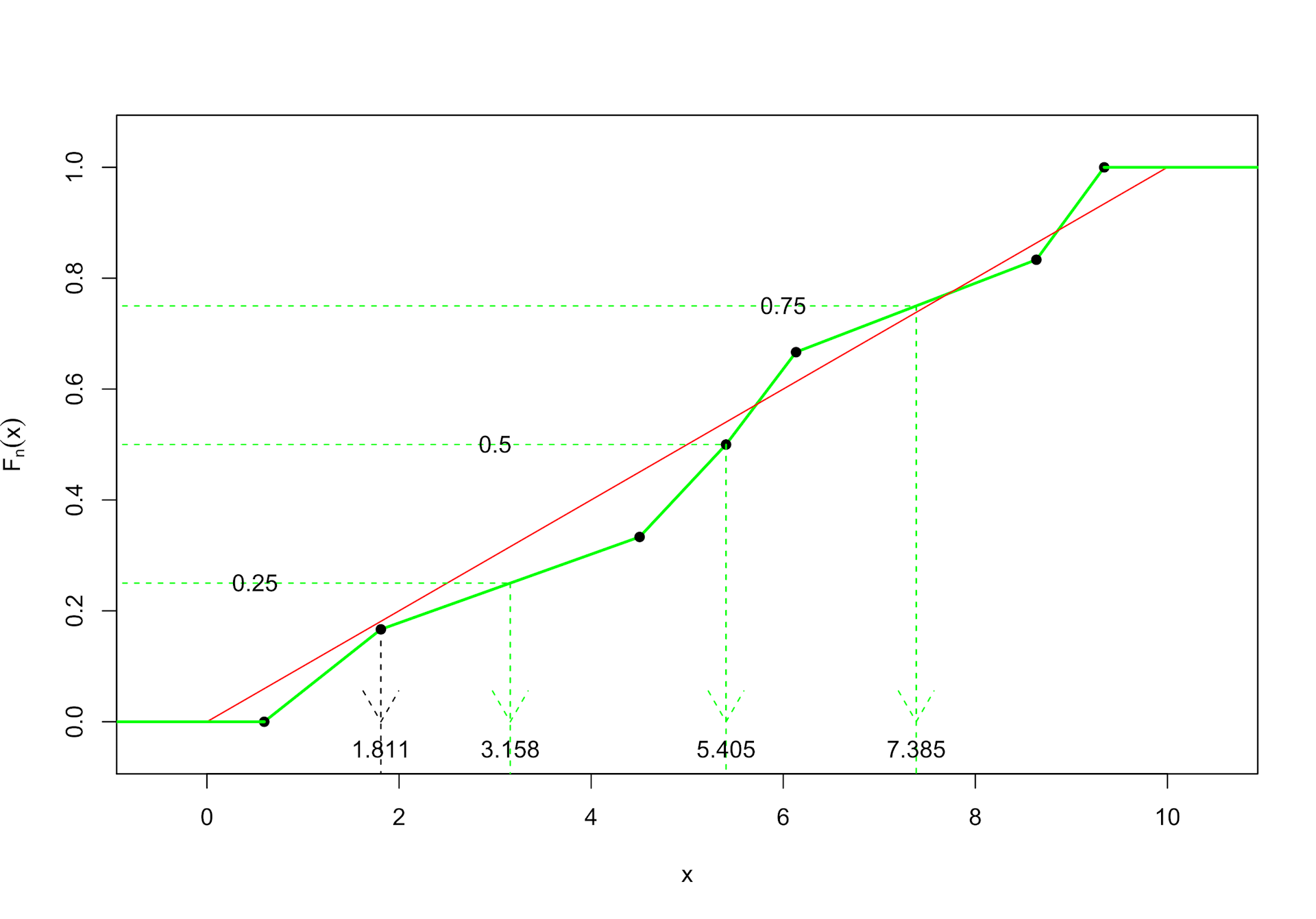Mit dieser Konstruktion erhalten wir eine Annäherung der unbekannten Verteilungsfunktion (bzw. genauer genommen der Umkehrfunktion auf dem offenen Intervall (0;1) ) und können wieder das bei der wahren Verteilungsfunktion eingesetzte Prinzip benutzen. Im Bild sehen wir, wie die Quartilsschätzer und der Median für die Stichprobe ermittelt werden. Bei 7 Beobachtungen liegt der 4. Wert 5.405 genau auf Höhe 3 / 6 = 0.5 und wir erhalten somit diesen konkreten Wert als Median. Bei den Quartilen wird bei n = 7 zwischen jeweils zwei Werten interpoliert.