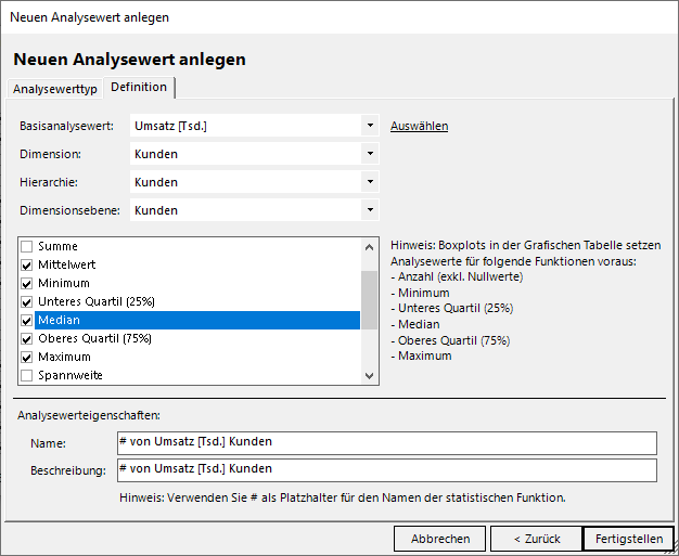 Für einen Boxplot legen wir im folgenden Menü zwingend die auch im sichtbaren Hinweis genannten 6 Analysewerte an. Darüber hinaus gäbe es weitere, für den Boxplot nicht relevante Kennzahlen wie Varianz oder Spannweite, die wir hier auswählen könnten. Zur Definition benötigen wir neben dem Basisanalysewert noch die Ebene der Dimensionselemente: