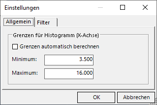 Einige Kunden wünschten, dass DeltaMaster den verfügbaren Platz für das Histogramm komplett ausschöpft. Bisher war das schon möglich, indem der Wertebereich für Grafikachsen direkt in den Eigenschaften des Analysewerts knapper bemessen wurde. Nun gibt es zusätzlich unter den Einstellungen der Verteilungsanalyse die Möglichkeit, das Anzeigeintervall der Achse zu verkleinern. In der Statistik der Verteilungsanalyse – oder in der Grafischen Tabelle von oben – lesen wir ab, dass das Minimum in Sparte A bei 3.960 und das Maximum bei 15.489 liegt.