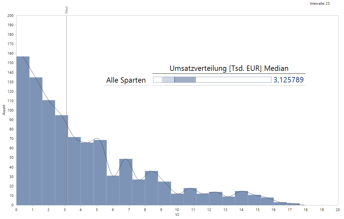 Die Daten zur Sparte A passen aber, um die im Release 6.6.1 eingeführte Neuerung in der Verteilungsanalyse zu erläutern. Schauen wir zunächst auf das Histogramm, das für Sparte A entsteht: