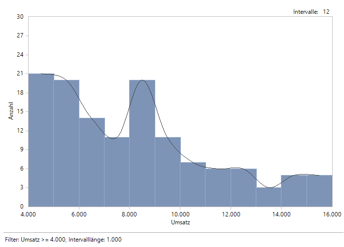Möchten wir ein Histogramm für diesen Ausschnitt erstellen, müssen wir begleitend auf dem anderen Reiter einen Filter Umsatz >= 4000 setzen, dann ist diese Einstellung erlaubt und wir sehen ein Histogramm für die beschnittenen Daten: