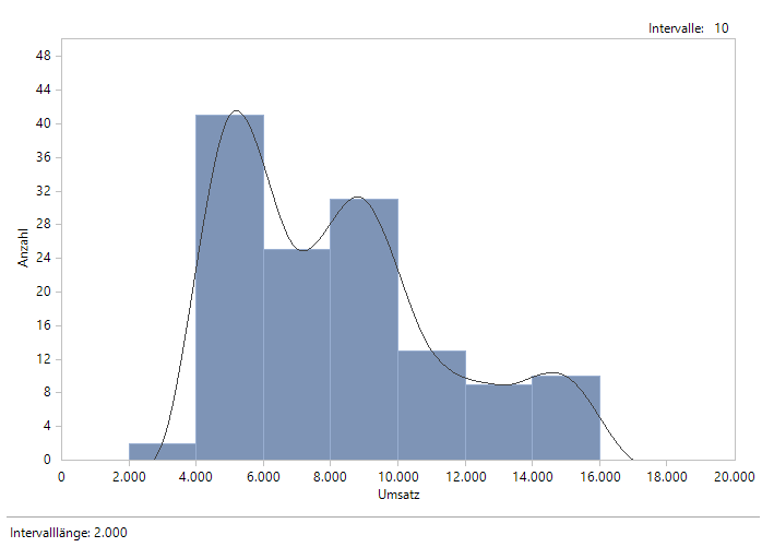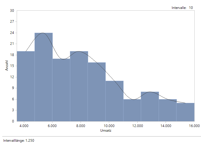 Die Verteilungsanalyse zeigt detailliert die Anzahlen der Kunden mit verschiedenen Umsätzen innerhalb von Umsatzklassen, die durch die Angabe gleichgroßer Intervalle definiert werden. Die Festlegung der Intervalle erfolgt indirekt durch die Angabe der Anzahl der Intervalle.