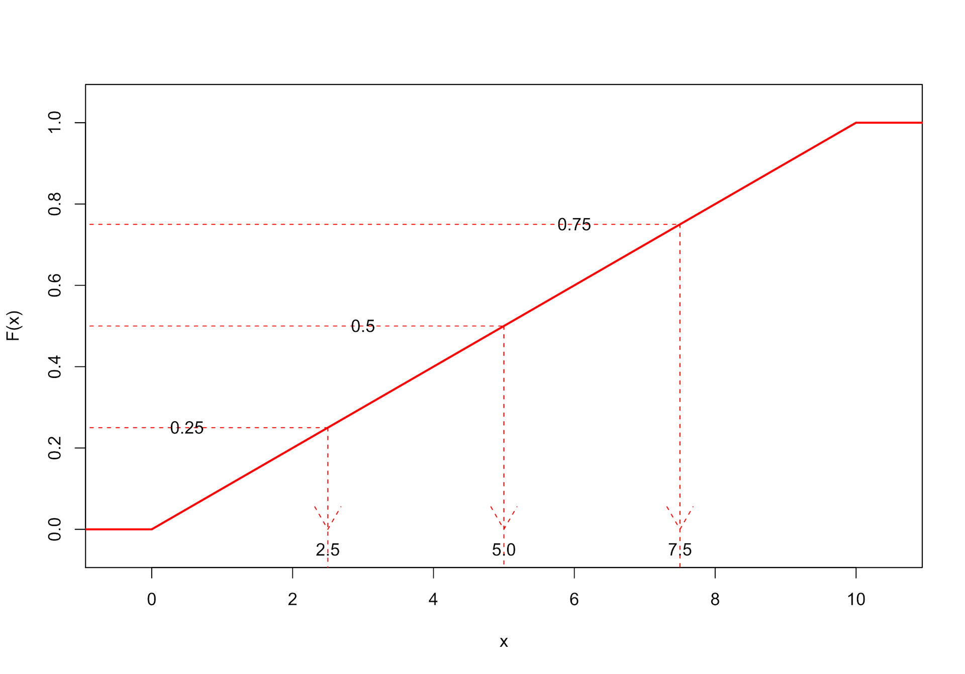 In der Grafik gehen wir bei der Ermittlung von Quantilen nun umgekehrt vor: Wir starten auf der y-Achse mit der gewünschten Wahrscheinlichkeit, gehen nach rechts, bis wir die Verteilungsfunktion treffen, gehen senkrecht nach unten und lesen den Wert auf der x-Achse ab. In unserem Fall ist der x-Wert bei einer Vorgabe y = P(X<=x) mit 0 < y < 1 eindeutig bestimmt, da die Verteilungsfunktion streng monoton wächst.