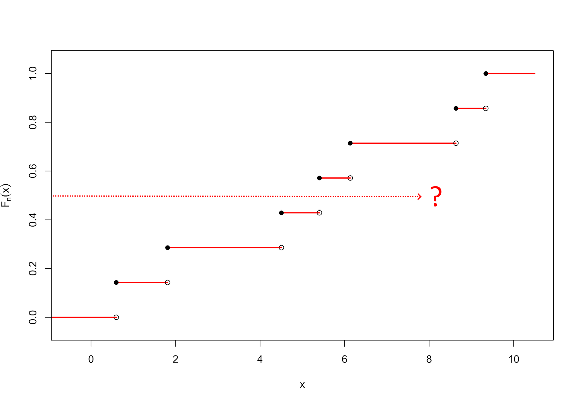 Die im theoretischen Fall geschilderte Vorgehensweise, ein Quantil zu berechnen, ist hier mit Problemen verbunden: Da die empirische Verteilungsfunktion nicht stetig ist, treffen wir die Funktion bei Projektion von links dummerweise gar nicht, wie es die Grafik im Falle des Medians (y = 0.5) vermittelt. Es kann auch sein, dass wir exakt auf der Höhe eines Segmentes liegen und somit gleich ein ganzes Intervall zu diesem Wert y gehört.
