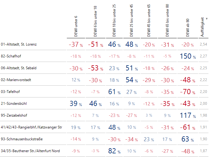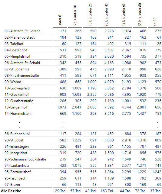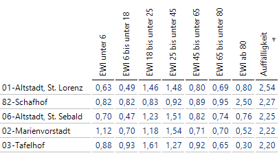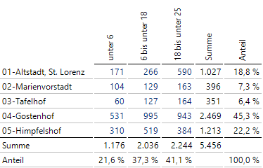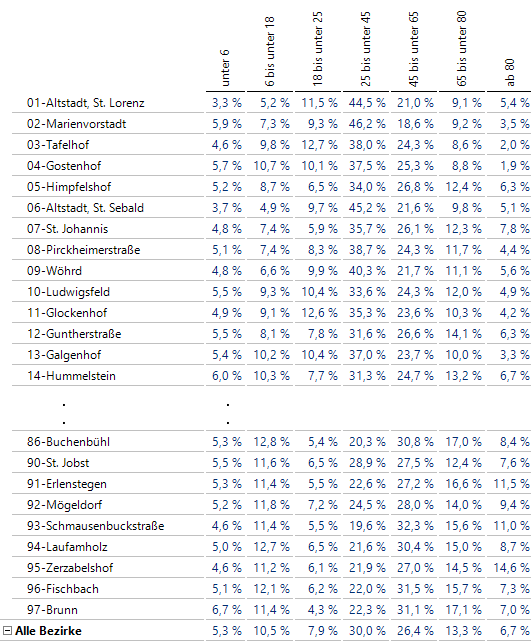 Beispielsweise ist in 01-Altstadt, St. Lorenz die mittlere Altersgruppe von 18 bis 45 Jahren besonders stark vertreten, mit 50 Prozent höheren Anteilen, während ältere Menschen und vor allem Kinder und Jugendliche unterrepräsentiert sind. In 14-Hummelstein liegt die Verteilung der Altersklassen sehr nahe an der Gesamtverteilung.