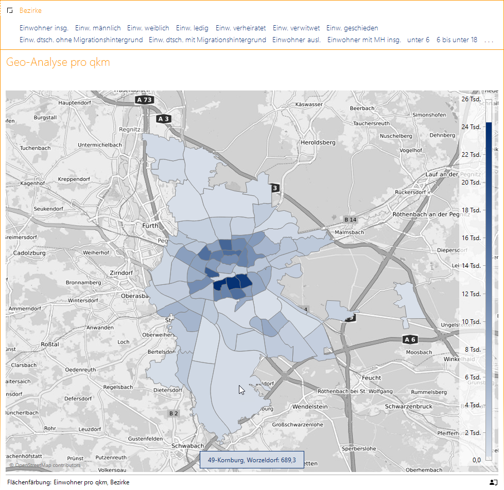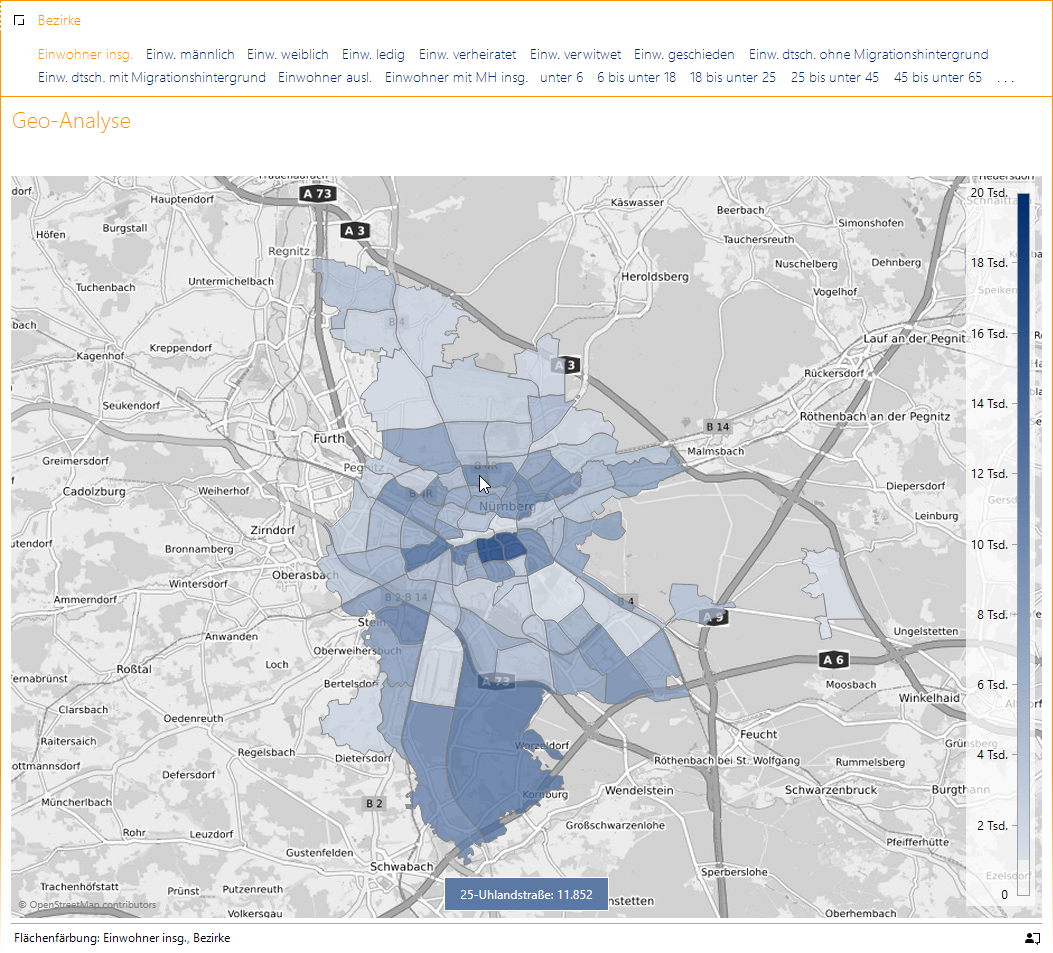 Den Bevölkerungsbestand einer Stadt können wir aus verschiedenen Blickwinkeln analysieren. Häufig variieren in den Stadtteilen Altersverteilung, Familienstand, Ausländeranteil und vielleicht sogar die Anteile der Geschlechter. Anhand der Daten von Nürnberg werden wir in diesem Beitrag mögliche Herangehensweisen der Analyse erläutern.