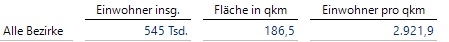 Im Datensatz ist pro Bezirk die Anzahl der Einwohner insgesamt gegeben. Darüber hinaus liegen die folgenden Differenzierungen der absoluten Anzahlen vor: