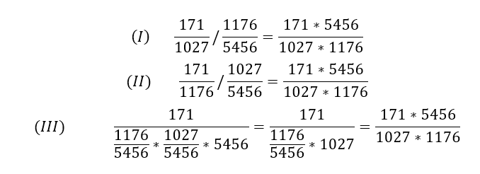 Bei der zweiten Interpretation schaue ich auf Anteile der Bezirke in einer Altersklasse. Bei der Altersklasse unter 6 befindet sich ein Anteil von 171/1176 im Bezirk 01-Altstadt, St. Lorenz. Insgesamt befinden sich 1027/5456 (= 18,8 %) in diesem Bezirk. Teile ich diese beiden Anteile durcheinander, ergibt sich in (II) das gleiche Ergebnis wie in Fall (I).