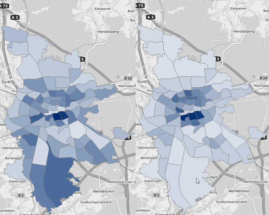 Wenn eine Kennzahl normalerweise proportional mit der Fläche wächst, muss man bei der Interpretation von absoluten Anzahlen aufpassen. Größere Flächen werden dann automatisch dunkler gefärbt, auch wenn die Bevölkerungsdichte in allen Bezirken konstant sein sollte.