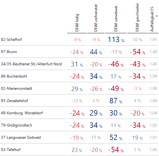 Für die Bezirke berechnen wir die Anteile der vier möglichen Familienstände und setzen sie ins Verhältnis zu den Gesamtanteilen. Danach ziehen wir eine 1 ab und erhalten somit die prozentualen Abweichungen zu den Gesamtanteilen. Dann berechnen wir wieder die Summe der Absolutbeträge der prozentualen Abweichungen und benutzen diese als Auffälligkeitsmaß. Die auffälligsten Bezirke sind gemäß diesem Maß die folgenden: