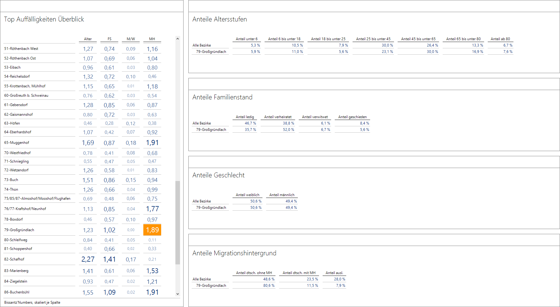 Im Beispiel fällt der recht große Wert in 79-Großgründlach beim Migrationshintergrund auf und die Analyse der nun aktualisierten Tabelle rechts unten zeigt, dass hier im Gegensatz zu ganz Nürnberg der Anteil deutsch ohne MH sehr hoch liegt.