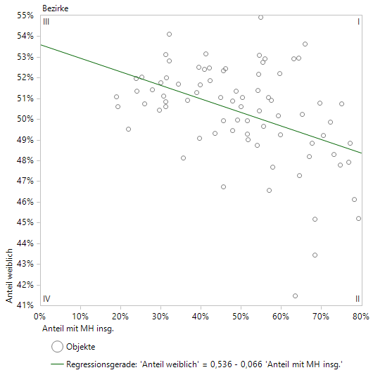 Plotten wir den Anteil der Frauen gegen den Anteil der Einwohner mit Migrationshintergrund, liegt eine sichtbare Korrelation vor. Die in der Portfolioanalyse angepasste Regressionsgerade zeigt fallende Tendenz: je größer der Anteil mit MH insg., desto kleiner der Frauenanteil: