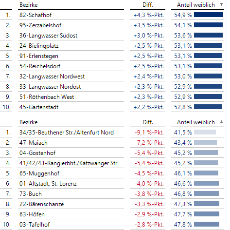 Bei den Geschlechtern männlich/weiblich bietet es sich an, den Frauenanteil in den Bezirken zu berechnen. Der Anteil insgesamt beträgt 50,6 %, aber in den Bezirken variiert der Anteil beträchtlich von 41,5 % bis 54,9 %: