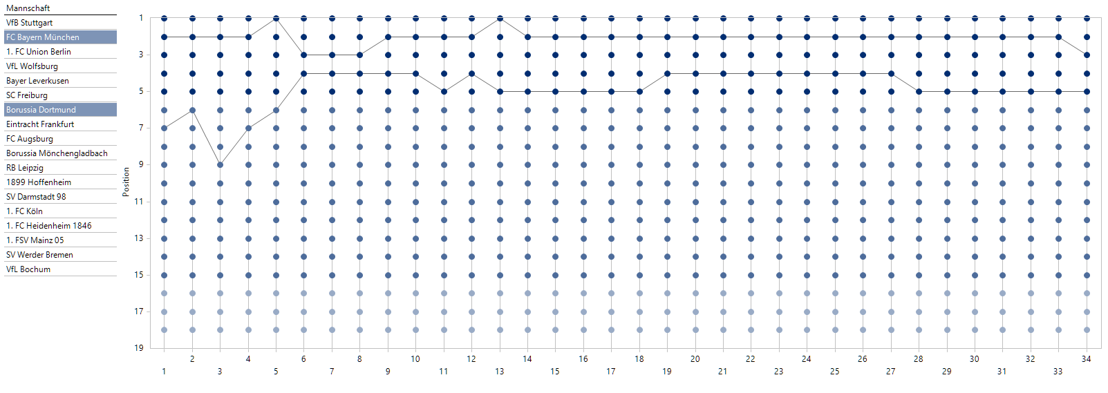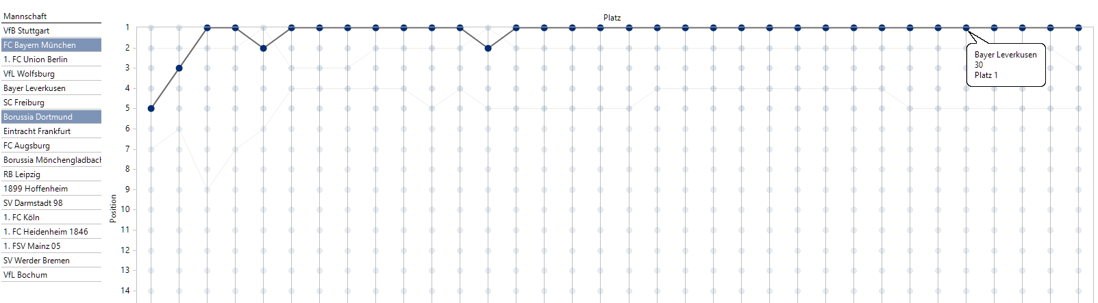 Mit Mouseover können wir den Verlauf einer beliebig gewählten Mannschaft einblenden, beispielsweise von Bayer Leverkusen:
