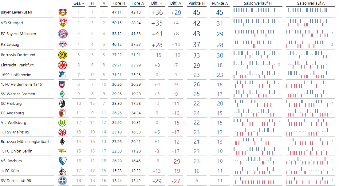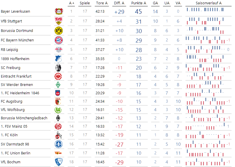 Bayer Leverkusen führt wenig überraschend die Heim-Tabelle an. Für die Auswärts-Tabelle ergibt sich: