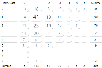 Außerdem scheint es bei völliger Abwesenheit von Ahnung von Fußball sowieso eine gute Idee zu sein, der Gastmannschaft exakt 1 Tor zuzugestehen. Egal, ob die Heimmannschaft 0, 1, 2, 3 oder 5 Tore geschossen hat: Die häufigste Toranzahl der Gastmannschaft war in diesen Fällen immer die 1. In den anderen Fällen 4, 6, 7 und 8 ist die Differenz zum maximalen Wert eins oder null.