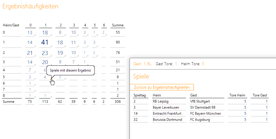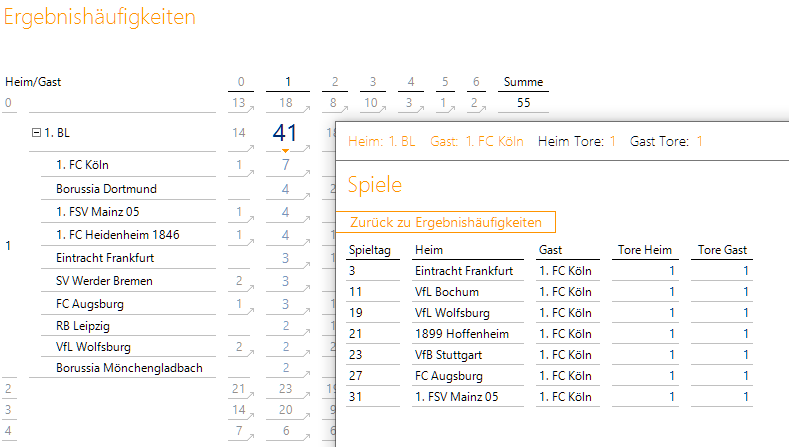 Arbeiten wir mit Verknüpfungen und somit mit einem zweiten Bericht, können wir beispielsweise per Navigation die 41 der 1:1-Ergebnisse nach der Gastmannschafts-Ebene aufklappen und anschließend den Navigationspfeil bei der 7 vom 1. FC Köln anklicken: