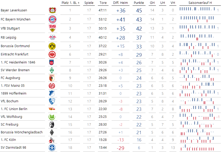 Nun untersuchen wir, wie sich das Heimspielrecht bei den Bundesliga-Mannschaften auswirkt. Dazu schauen wir auf zunächst auf die Tabelle, die sich nur aus den 17 Heimspielen ergibt: